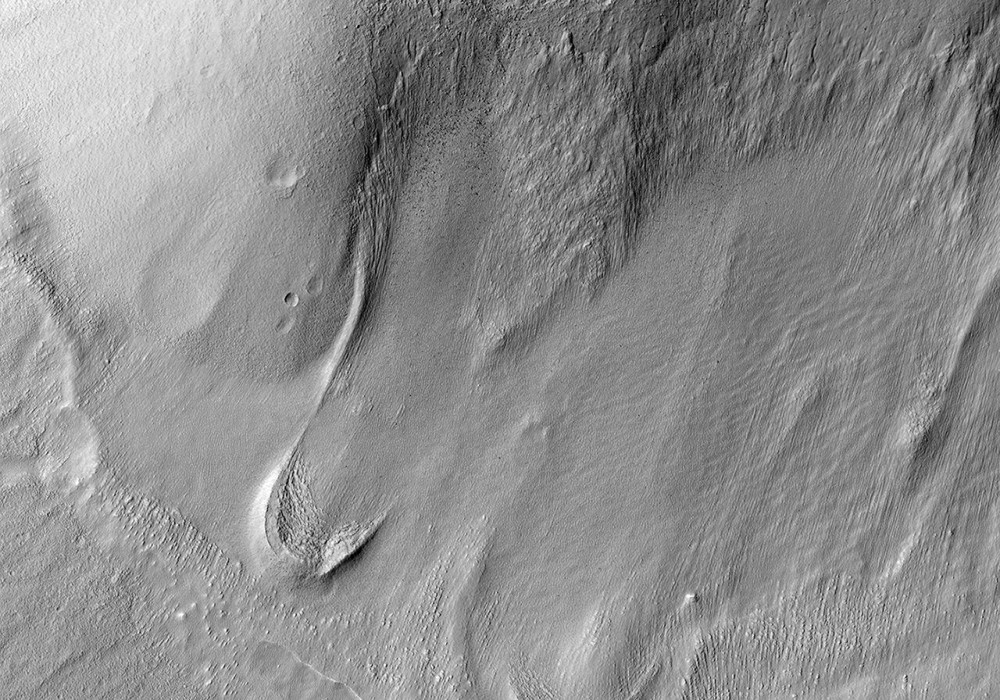 Lobate (or tongue-shaped) flow features such as those seen emanating from the hill at the north end of this image are common in this region east of the Hellas Basin.